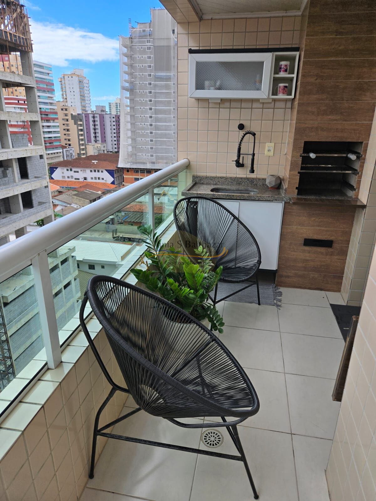 Ampla sacada gourmet com churrasqueira a carvão, a sacada dá a volta no apartamento fazendo os cômodos se comunicarem.
